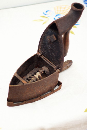 Consumia avidamente brasas, de preferência incandescentes, que se retiravam da fogueira com ajuda de umas tenazes, (convinha) sendo depositadas na parte oca do ferro. Depois de bem fechado com uma patilha de segurança, esperava-se algum tempo para o bem aquentar e, então, iniciava-se o tão moroso e cansativo processo- passar a roupa a ferro.