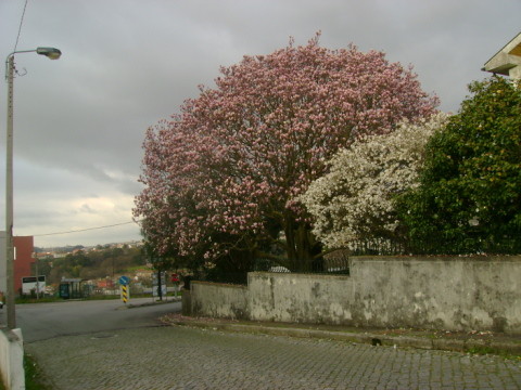 Antes de mais “minha” é quase como se fosse, porque me apropriei visionalmente desta charmosa árvore, (ver imagem). Nesta altura do ano, é das primeiras que florescem, quando me levanto e assumo à varanda do quarto, embriago-me, fico estático interiorizando aquela beleza colorida que me predispõe para um novo dia, absorvo pétala a pétala daquela majestosa contagiante magnólia como se fosse minha pertença. É uma calota florida prenhe de viço que não deixa indiferente o mais distraído transeunte que passa na rua debaixo da copa. A duração da sua floração é passageira, cerca de 15 dias, mas a sua visibilidade é arrebatadora.